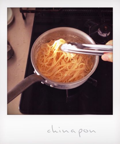 ⑧ゆであがったパスタをソースの鍋に加え粉チーズを振りかけて手早く混ぜ合わせる。