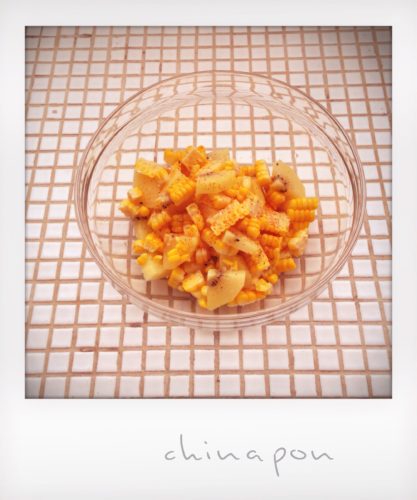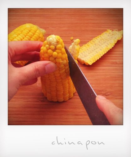 - ①ゆでとうもろこしは包丁で実を削いで食べやすい大きさにほぐす。