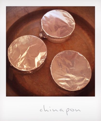 ⑤ココットにアルミホイルをピッタリかぶせて容器の半分くらいまでのお湯に浸けて湯煎する。