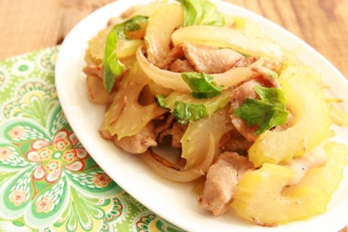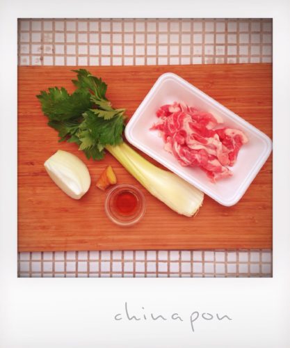 ①玉ねぎは5㎜幅に切る。セロリは薄切りにする。生姜は千切りにする。セロリの葉はちぎる。豚肉は大きければ食べやすい大きさに切る。