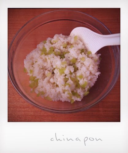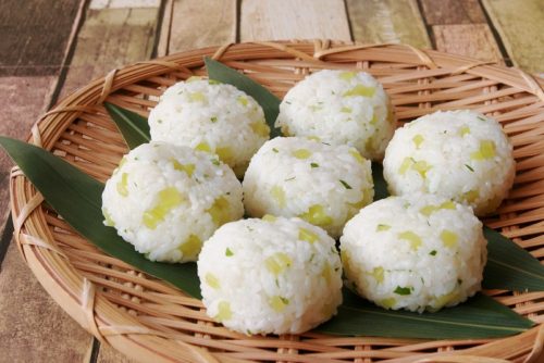 - 温かいごはんにふきと木の芽を混ぜて手水を付けながらおにぎりする。