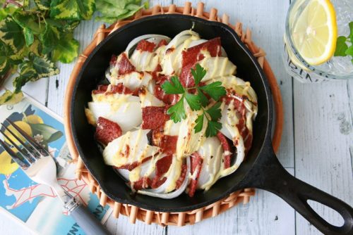 - ③スキレットにオリーブ油を少々馴染ませて玉ねぎを並べ、間にコンビーフを散らす。