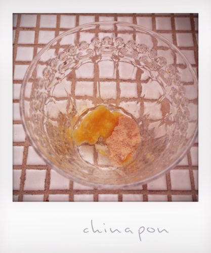 - グラスにすりおろしたレモン、キビ砂糖、塩を入れ焼酎を注いでよく混ぜる。