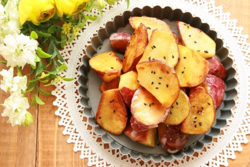 ④揚げたサツマイモを②に入れて絡め、黒ごまをふる。