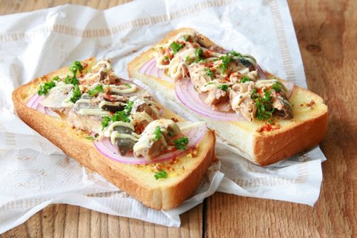 - 鯖の水煮缶、オニオンスライス、マヨネーズ、バター又はマーガリン、粒マスタード、食パン